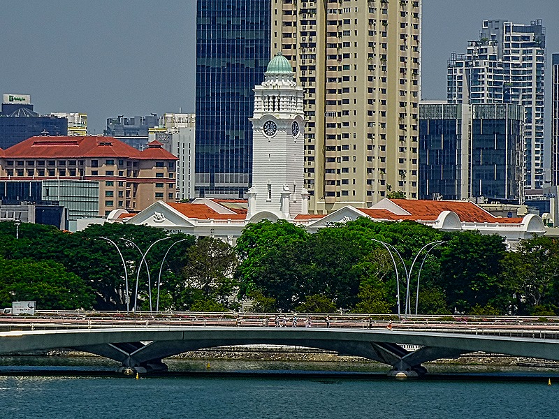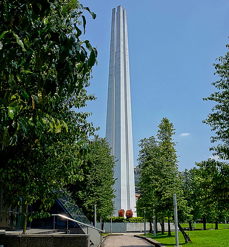 After leaving the bridge we walked past the Merlion and stopped briefly at the Esplanade, taking a breather on some small bleacher seats on the bay side of the building, We crossed a large and busy street through a large subterranean passage under an intersection and walked to the Civilian War Memorial. The Japanese occupation of Singapore from 1942 to 1945 was quite brutal. In particular, tens of thousands of men of Chinese ethnicity were massacred in a drive to suppress opposition to Japanese rule. This memorial was begun in 1963 to commemorate them, but was broadened to include victims of other ethnicities as well. The memorial was officially unveiled in February, 1967, but the year before a ceremony was held to inter more than 600 urns containing remains of unknown civilians killed during the occupation. The memorial is a very tall white obelisk divided into four sections representing different ethnicities honored by the memorial. It is surrounded by a fountain and a park, which is in turn surrounded by many tall downtown buildings. The official name is “Memorial To The Civilian Victims Of the Japanese Occupation 1942 – 1945.”