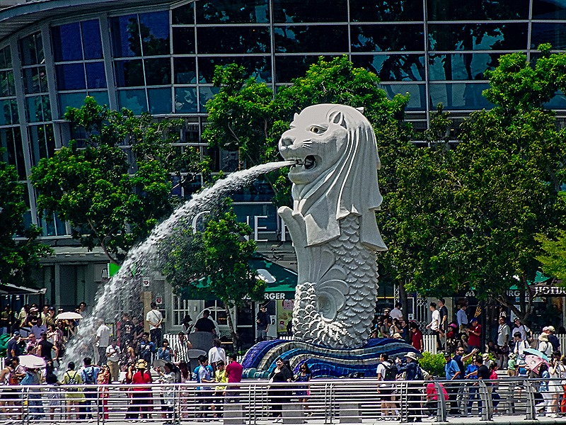 *The Merlion is a large sculpture/fountain of a beast that is part lion and part fish and spits a stream of water into the bay. It was created in 1972 and moved to its present location in 2002. The Merlion was dreamed up by the local tourist board in 1964 to be a symbol of Singapore and part of the board’s logo.