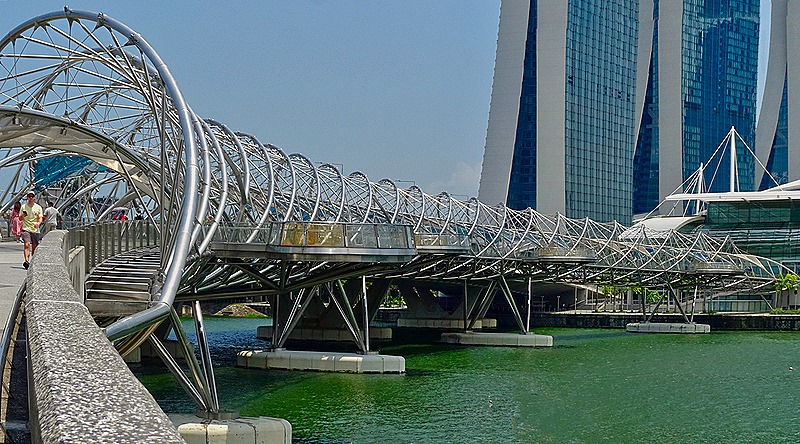 We crossed the Helix Bridge to reach the Marina Bay area. Opened in 2010, the design of this metal pedestrian bridge is based on the structure of the DNA molecule and the views of and from the bridge as you cross are endlessly interesting. Looking back as we crossed we also had a different view of the Sands hotel.