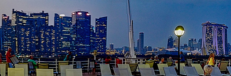 We got dinner in the Lido buffet and ate it on the aft deck, which had a great view of Singapore, looking fine as the city lights started coming on at twilight.