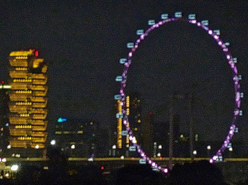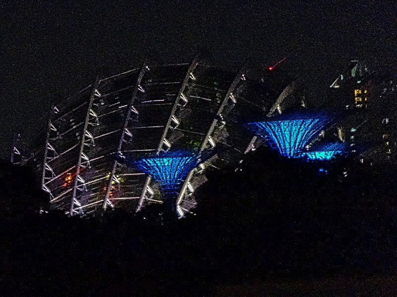 After dark the Supertrees in the Gardens by the Bay were lighted. These are more than a dozen towering structures (about the height of a 16 story building), each with an inverted cone at the top to emulate the look of a tree, and each filled with many plants filling up its trunk. At night these Supertrees are lighted in ever changing colors (with musical accompaniment we are told, although we couldn’t hear that from the ship). Quite an unusual sight, with some of Singapore’s other iconic buildings (such as the Sands hotel and the Singapore Flyer) lighted up as well.