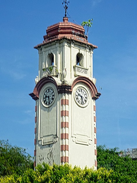 Before walking back to the ship we visited the library, one part of a large building. It wasn’t open but we rested a bit in a covered patio outside (did we mention it was REALLY hot and humid?). Through a back window of the patio we saw the blue domed tower of St Joseph’s Catholic Church, which opened in 1912 to serve the Portuguese community. On a wall of the building housing the library was a mural of children enjoying books. On the way there we passed an interesting block of old buildings painted in a variety of bright colors.