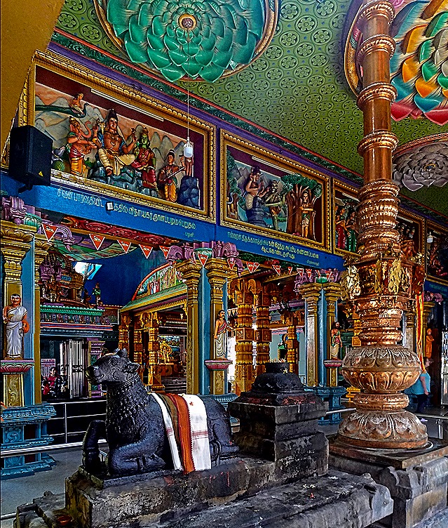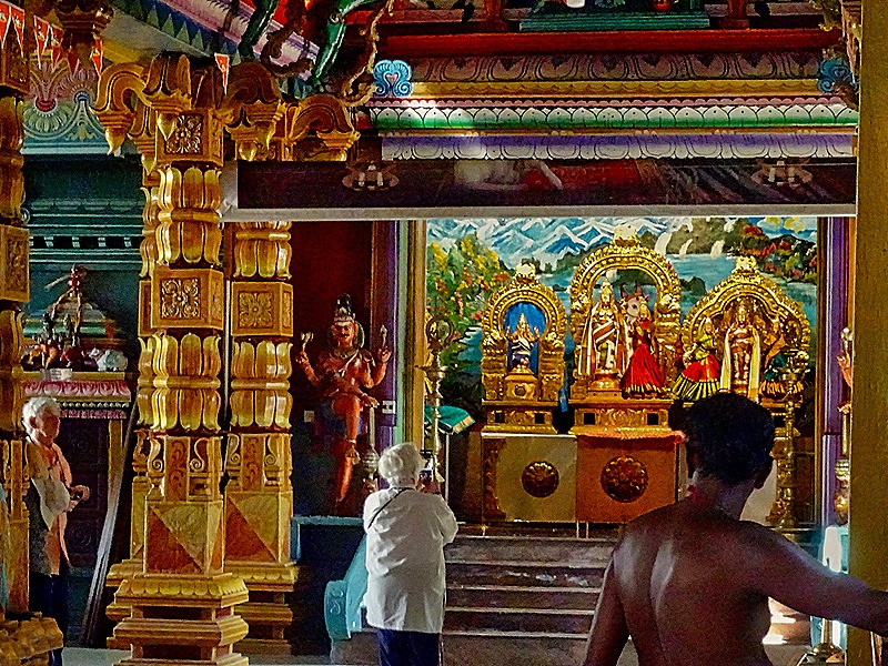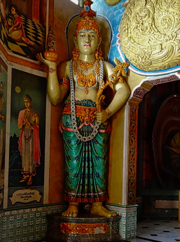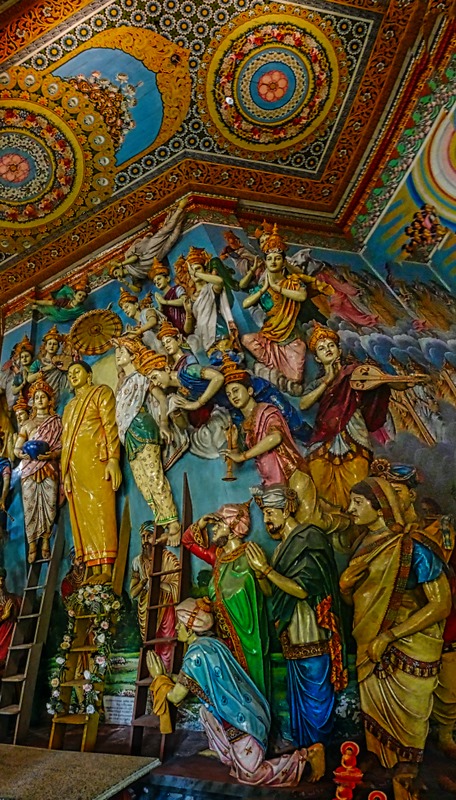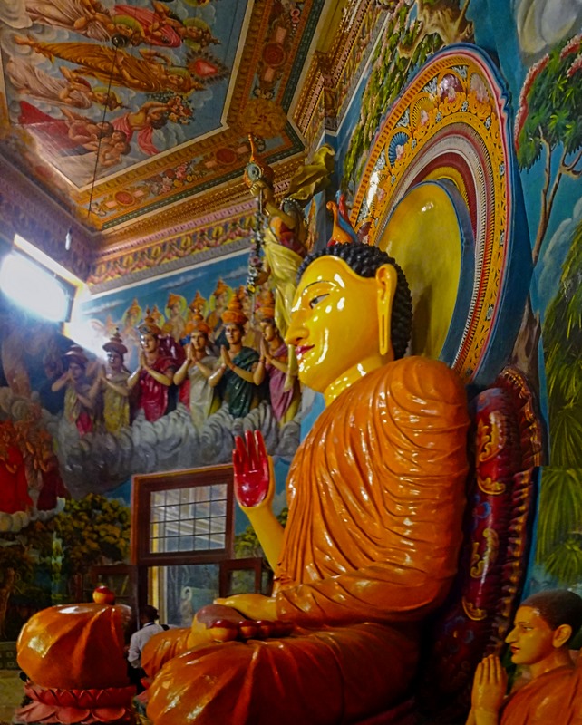 Our next stop was to visit the Asokaramaya Buddhist Temple, built in the 1870’s and expanded several times since. It is fairly plain on the outside, painted mostly white or muted yellow with none of the riot of color of the Hindu temples we saw this morning. But the inside is full of colorful statues of Buddha and other deities with well regarded Buddhist paintings on the wall, mostly about the life of Buddha.