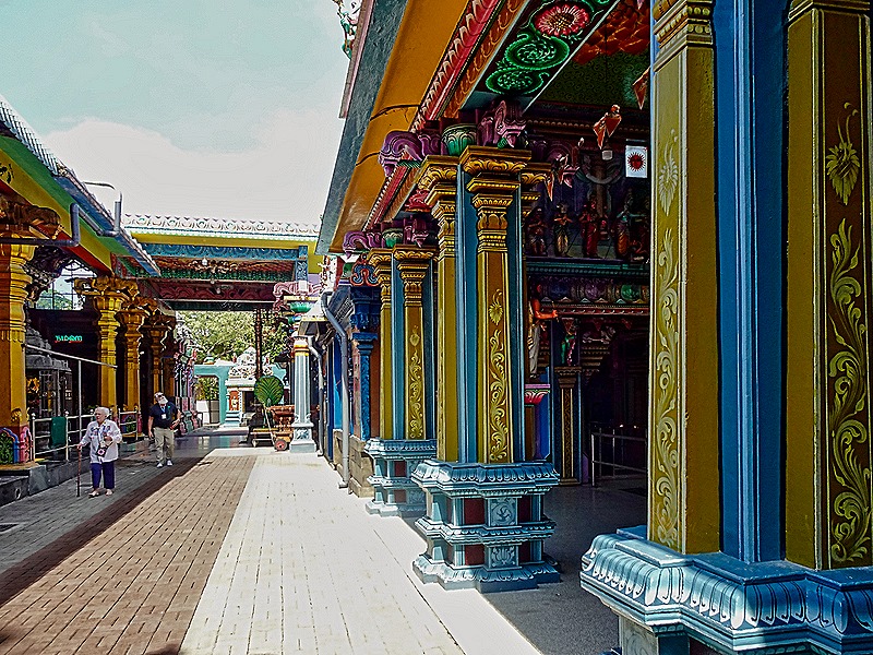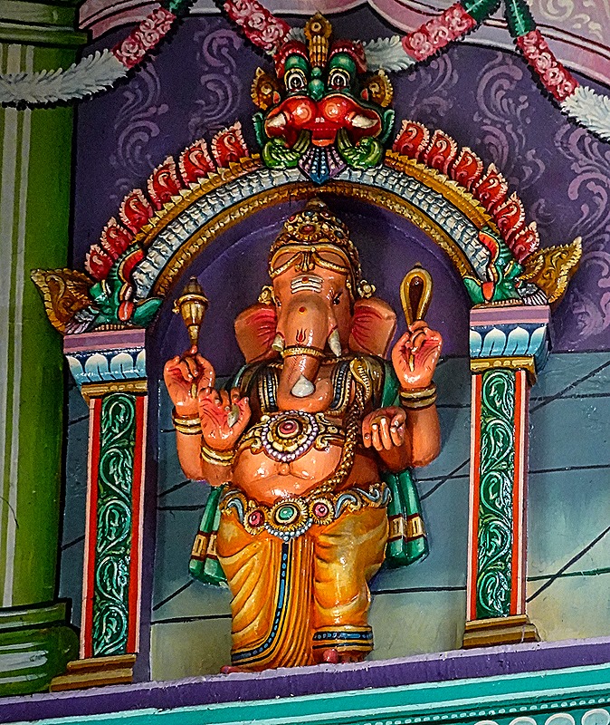 The rooms inside and the passageway were really very colorful, including the ceilings (always look up). We can’t identify many of the items in these pictures, but the elephant god is certainly Ganesa.