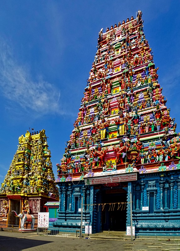Our first visit of the day was to Sri Kailawasanathan Swami Devasthanam Kovil, a Hindu temple complex. Said to be the oldest Hindu temples in Sri Lanka, construction began in 1783. The two main temples connected by a pass through are dedicated to Shiva and Ganesa (aka Ganesh), and there are smaller shrines to other deities on the grounds as well. Like the other Hindu temples we have visited, the front has a tall roof over the entrance that is covered with colorful sculptures of Hindu deities.