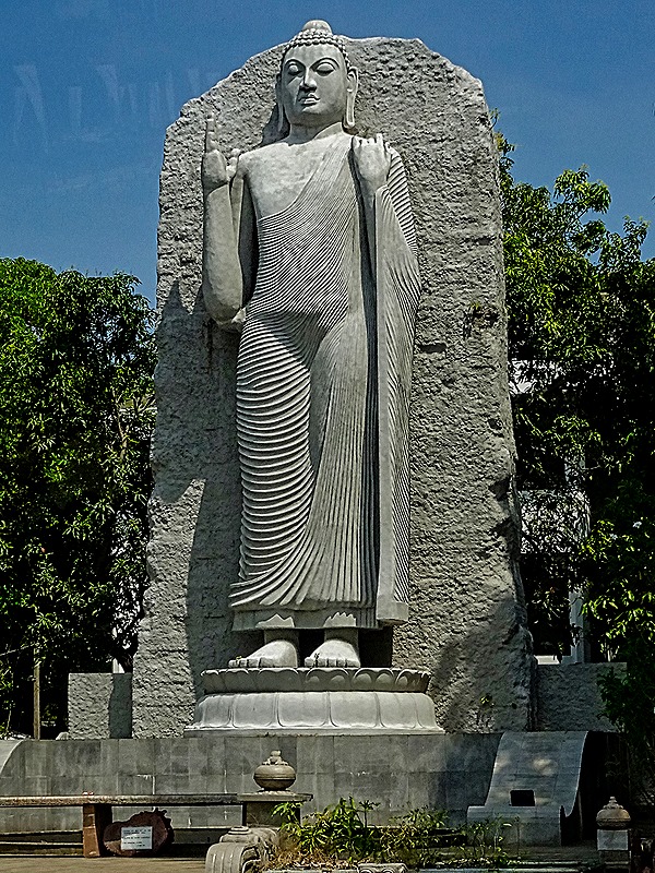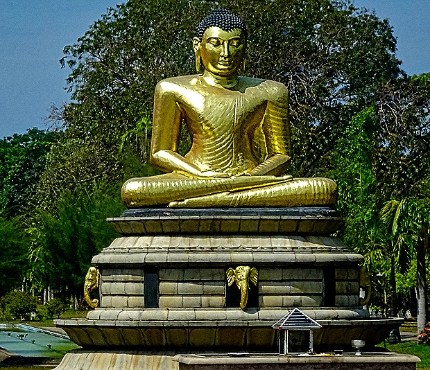Near the current town hall were two other landmarks. The Dewatagaha Mosque, built in 1820, contains the remains of a Muslim saint. We think this is a picture of this mosque, but we have been unable to find another picture of it with green paint highlights, so the green may be very new. We also saw a very large golden sitting Buddha at the entrance to Vihara Maha Devi Park. Before the 1950’s this was called Victoria Park and we understand there was a statue of Queen Victoria here.
