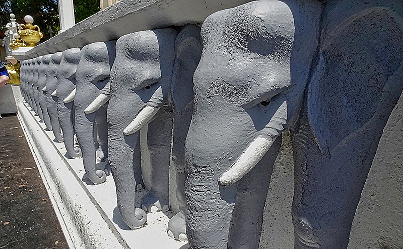 Outside in a rear courtyard of the temple is a Bo tree, rising from a low protective structure ringed with small Buddhas in niches. This species of ficus is the type of tree under which the Buddha sat when he attained nirvana. There are several stupas on the temple grounds that are said to contain relics meaningful to this temple, and we saw a delightful low wall shaped into a row of elephants. On the street outside we saw tuk-tuks, three wheeled vehicles used as taxis. Their drivers can be very aggressive in trying to recruit you for a tour; on past visits we have been followed down streets quite a way before they gave up.