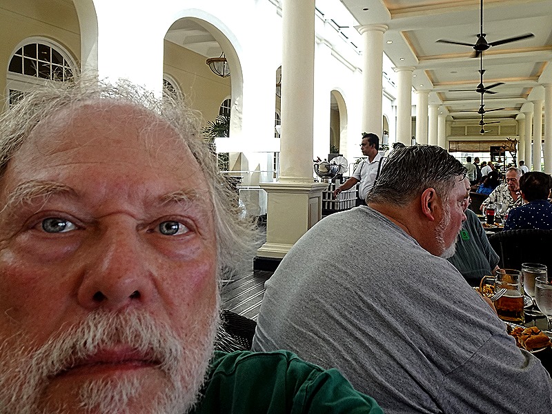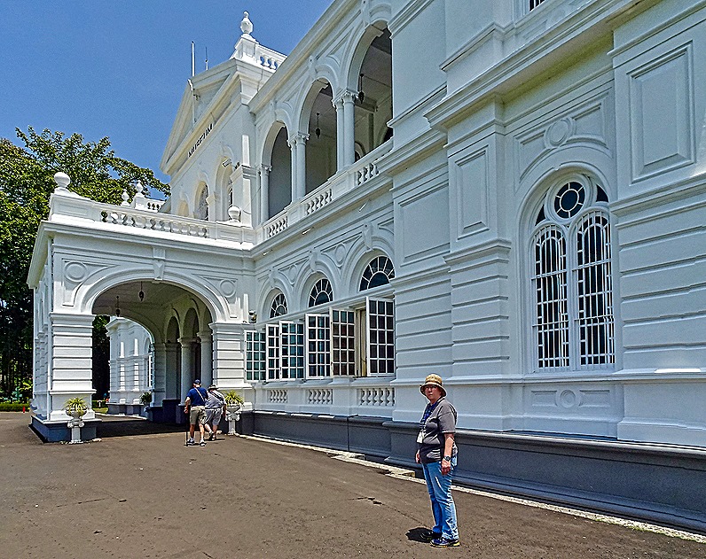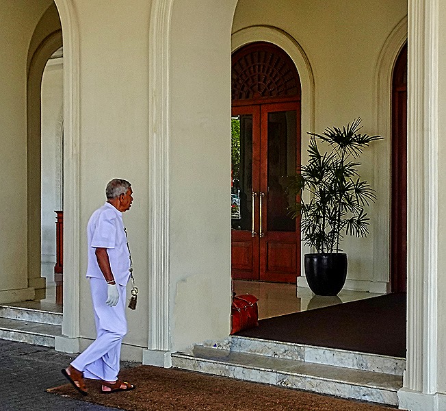 Opened in 1864, the Galle Face Hotel is one of the oldest hotels in Asia. It was expanded a couple of times during the 19th century and was last refurbished in 2015 (a few months before our first visit to Colombo). The hotel has hosted many celebrities, and Arthur C. Clarke, Mark Twain, Anton Chekhov and Sir Arthur Conan Doyle are prominent among the authors who have written here. The hotel forms the southern boundary of the large seaside park called Galle Face Green, from which its name derives. We had lunch here once before inside a hotel restaurant but this time we ate at their grand buffet outside on a very large porch called The Verandah. The buffet line was long, confusing and crowded and there was too much food on offer, but the food was pretty good. After lunch we walked down to the ocean’s edge, past a sitting area called The Checquerboard. I suppose you could take your buffet lunch to eat there, but unlike the Verandah it is out in the very hot sun, so it was no surprise that no one was sitting there when we saw it. As we were leaving the front of the hotel we saw what we think was the white gloved doorman who had been helping someone with their luggage.