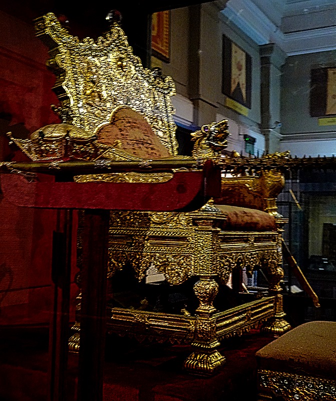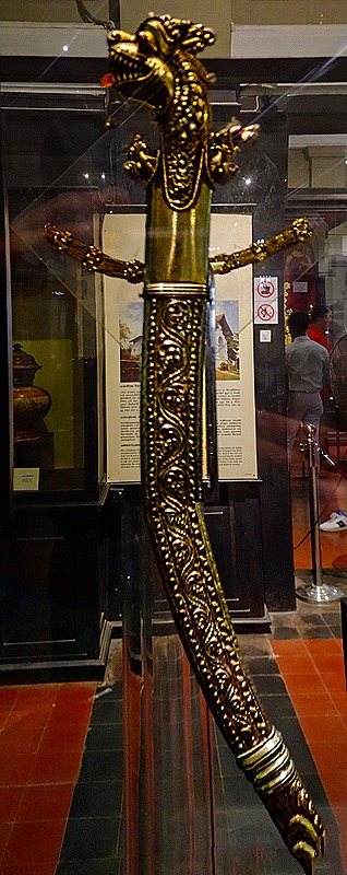 Here are pictures of just a handful of the exhibits we saw. The first two are 12th century table size bronze sculptures of Shiva dancing. The next two are front and side views of the royal seat given by the Dutch to the king of Kandy in 1693 and used by his successors until 1815 when it was captured by the English (returned in 1934). The third pair of pictures show a 12th century sculpture of the god Ganesa and a king’s silver dragon head sword. Last is a relief sculpture of a man with elephants on each side of him.