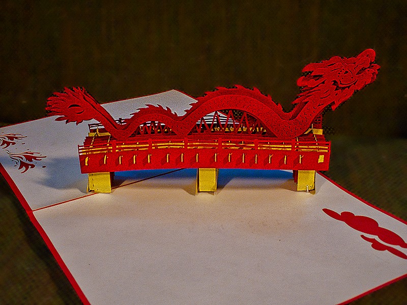 Outside the post office were a number of vendors selling souvenirs. One inexpensive type of souvenir that we had seen here, but nowhere else, before is a card that opens up like a child’s pop-up book to show a fold-up cardboard structure. Some are Vietnamese landmarks, some are flowers, some are dragons, etc. We had looked at these before lunch and had told the vendor we would be back after lunch. I doubt she believed us, but she looked happy when we showed up again. We bought several of these cards, among them the Dragon Bridge in Da Nang (but the wrong color), the Ben Thanh market, the Japanese Bridge in Hoi An and a dragon boat. Each of these folds completely flat when you close the card, but stands up on its own when you leave the card open.