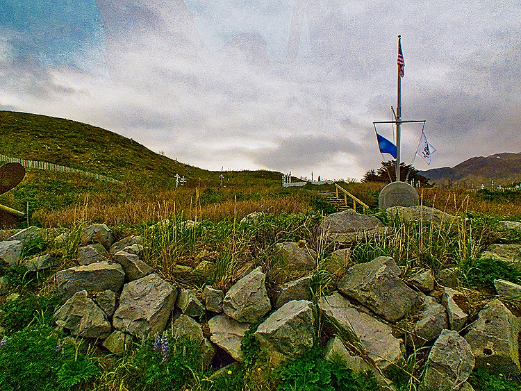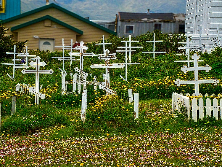 Perhaps the most distinctive building in town is the Russian Orthodox Cathedral, officially named the Church of the Holy Ascension. A chapel was built on this spot in 1808 and the church (with only one tower) replaced it in 1825. Due to wear and tear, probably due to the usually bad weather here, it was replaced in 1858 using the foundations and many of the timbers from the earlier church, and it finally gained its current form in the 1890’s, again incorporating pieces of the earlier churches. It very much resembles the Orthodox church we visited in Sitka and is reputedly filled with religious treasures, although we didn’t have time go go inside. Next to the church is a small graveyard dating to 1825 filled with white crosses in Orthodox style (with an extra cross bar). Nearby is the dark blue Bishop’s House, built in San Francisco in 1882 before being transported to Unalaska. The bishop who commissioned it died before having a chance to live there and is buried in the graveyard.