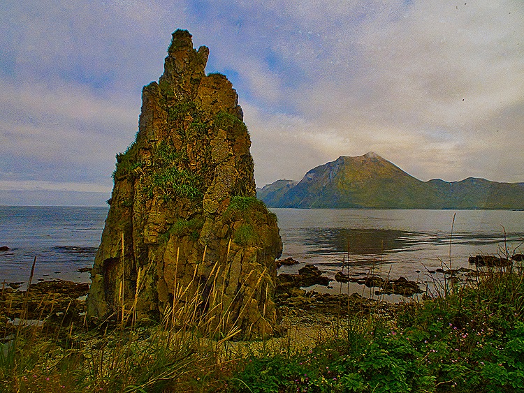 In passing we saw a fishing boat dock and also the Memorial Park, which includes several memorials to groups who lived and/or died here, including a brass propeller from a ship destroyed by the Japanese in 1942 that was installed here 50 years later and an old graveyard populated with Russian Orthodox crosses. On the way back toward town we passed a striking landmark called Little Priest Rock. It is an 80 foot tall rock that we understand some thought was shaped like the hat of a Russian Orthodox priest. It is on a small sandy beach where the neighboring mountain meets the water, although the tide must have been in when we were there because we couldn’t see much beach. It was big enough to see from the ship docked on the other side of the bay.