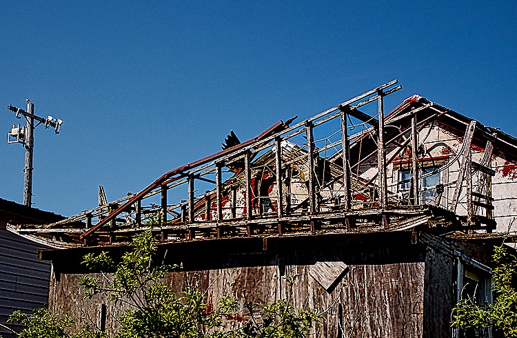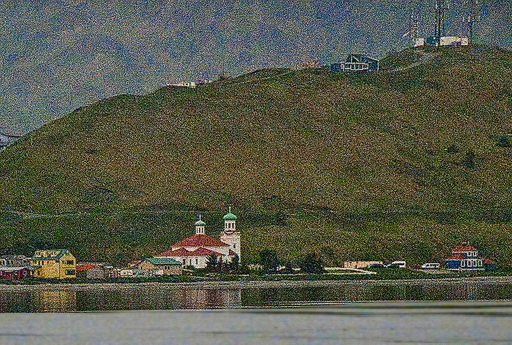 Across the water from the church we visited the underground hospital. Built during the war, we understand it had (or may still have) about 200 beds. It was not open to visitors, apparently for safety reasons. From the shore we had a nice view of the church and the bishop’s house across the water. Our last stop before returning to the ship (there was another excursion group waiting for our return) was at a red brick Tudor style building built in 1932 to house workers at the nearby Naval Radio Station. It originally had 6 apartments, but during World War II it was remodeled into housing for chief petty officers. It is reputed to be the only brick building in the Aleutians, although today it appears to be pretty dilapidated (obviously not a place to enter for a visit). There was a bald eagle sitting on the left gable.