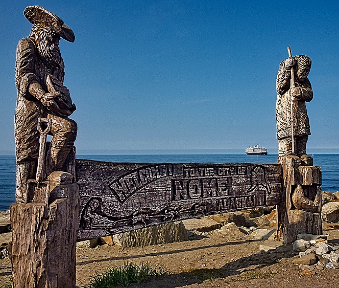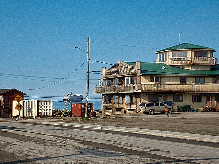 We sailed here from Dutch Harbor across the Bering Sea, one of the richest fishing areas in the world. It can often be rough water but it was rather calm when we crossed, although we were enclosed by a lot of thick fog. During our sea day before reaching Nome there was a presentation by the Captain, the Ice Pilot and an ice expert about what to expect. We were told that there was a lot of sea ice in the Bering Strait that was floating our way and that the weather was expected to be foggy enough that our tendering into Nome would likely be delayed several hours. This was discouraging . . . but it turned out to be a beautiful day in Nome, mostly sunny and clear and neither windy nor very cold. So after breakfast we tendered into the port.