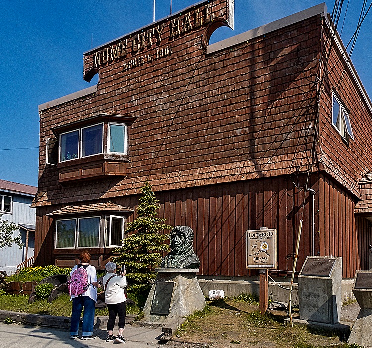 We walked along Front Street, passing a large carved wood welcome sign held up by pillars sculpted into a miner and an Inupiaq hunter. Across the street was the city hall, a two story wooden building that we understand was originally built by Wyatt Earp to house the saloon he operated from 1897 to 1901, leaving town with some $80,000, the equivalent of about $3 million today. In front of the building was a bust of Roald Amundsen commemorating the first flight over the north pole, led by Amundsen in a dirigible named “Norge” that flew from Spitsbergen to Alaska in 1926, executing an emergency landing about 75 miles short of its destination of Nome.