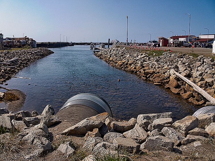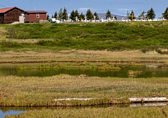 We continued to the port. Among other things we passed a building with two old dogsleds on top and saw a large cemetery on a hill. We mentioned that prices are high in Nome because everything has to be imported; case in point is gasoline, with regular unleaded selling for $6.29 per gallon when we had paid between 3 and 4 dollars while driving to Portland. When we reached the dock Mary joined a number of folks sitting under a shade erected by HAL waiting for the excursion to begin.