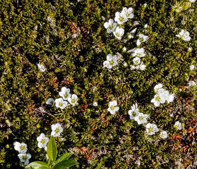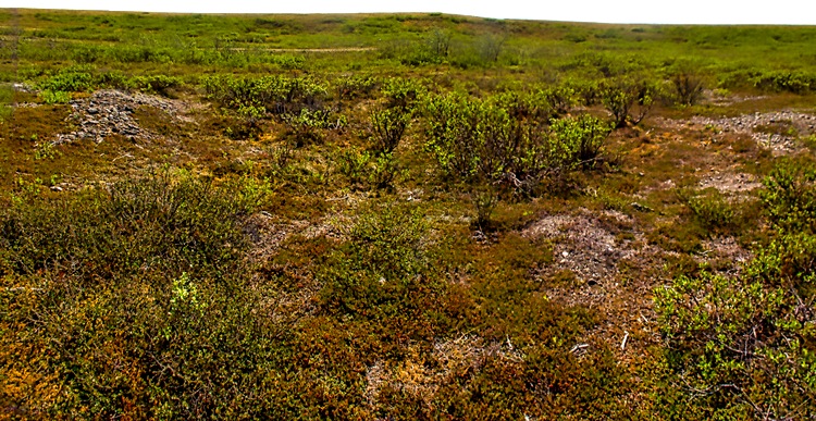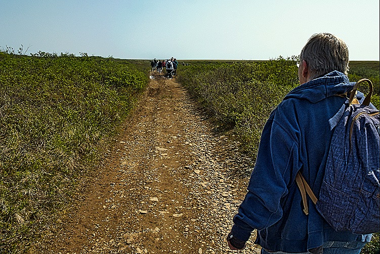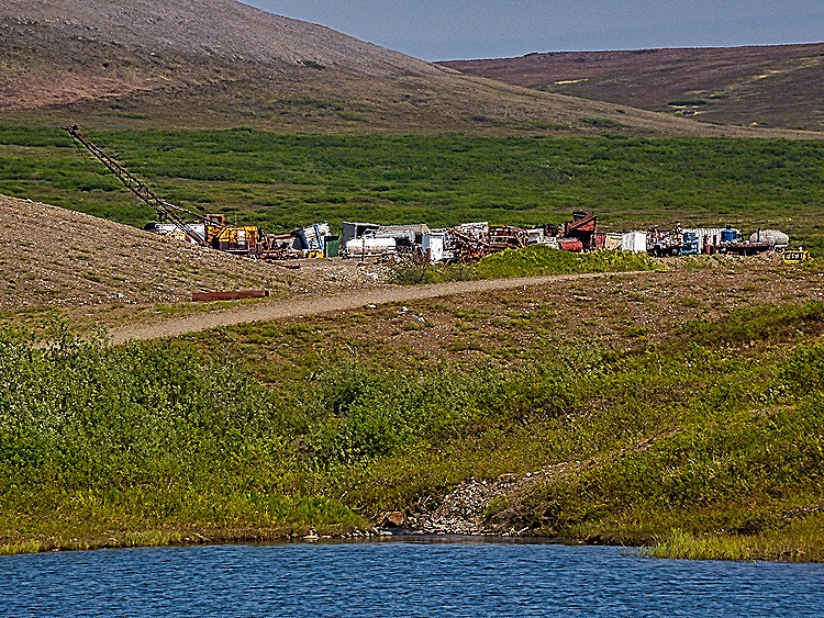 The afternoon excursion took us by bus through the tundra outside Nome to visit an old gold dredge. The road stopped well short of the gold dredge so we had to walk a mile or two over very rocky and uneven land to reach it (and then, of course, we had to walk back). The walk was a good bit longer than advertised and was more challenging than expected. There are no trees in the tundra but we saw many tiny flowers growing there. We did cross over a small but pretty creek with reeds growing in it on the way.
