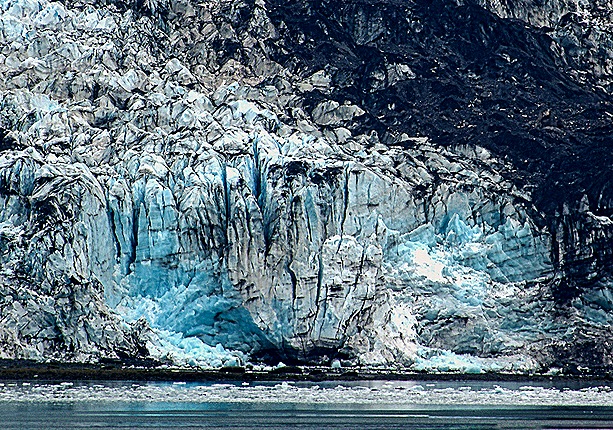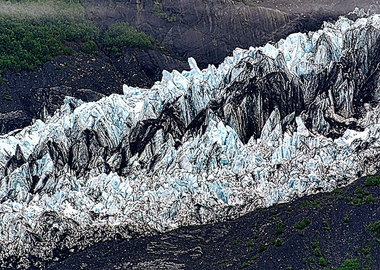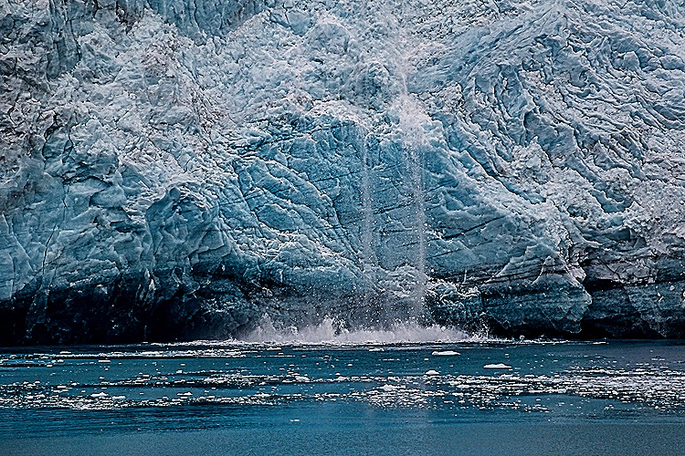 Glaciers are often blue, as in the pictures above, because as the snow compacts into very dense ice it squeezes out air bubbles, with the result that the ice reflects blue wavelengths and absorbs other colored light. Often the most interesting views of glacier ice are in close ups, showing clearly the varied patterns the ice displays. It is exciting when a glacier “calves,” meaning that part of the ice breaks off and falls in the water as it is pushed toward the sea. But this is very hard to capture in a photograph because the loud noise of the ice breaking off does not seem directional and the calving is over very quickly, so by the time you are able to point you camera toward it the calving is over and all that is left is the splash. Just what happened in the last picture below.