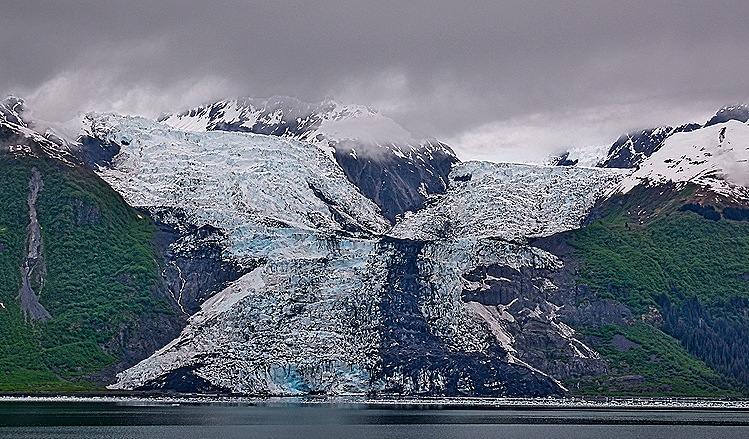 College Fjord contains five tidewater glaciers (ie. terminating in the sea water), five valley glaciers, and a number of smaller ones back from the water. We sailed past the tidewater glaciers and didn’t see the others. Even if they would otherwise have been viewable, there was a heavy cloud cover that came down to the tops of the tidewater glaciers so we couldn’t see anything above or beyond them.