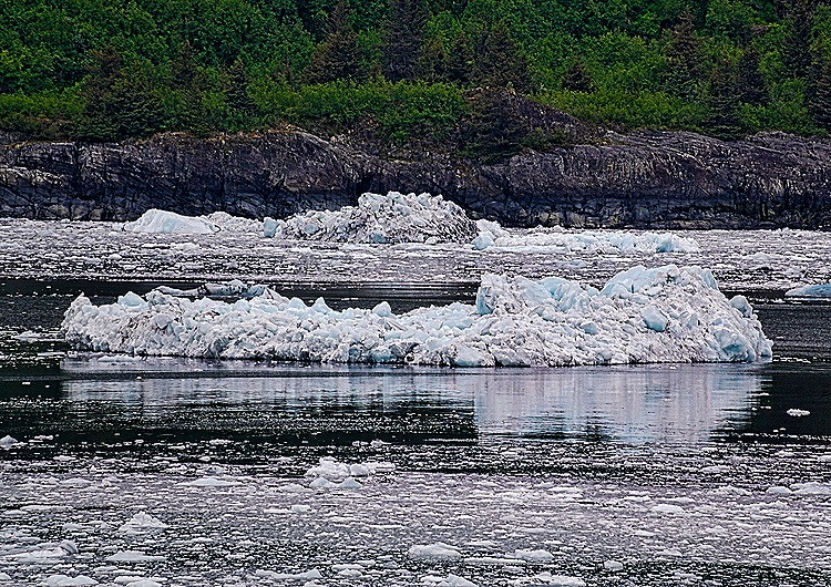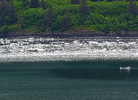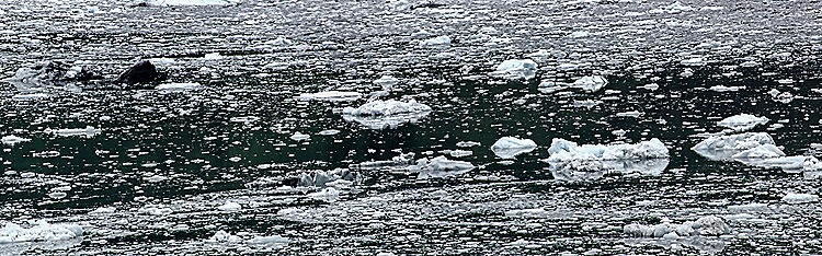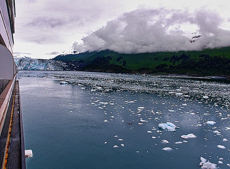 After a long time with the ship turning in front of Harvard Glacier so everyone could see it we sailed down the fjord, back the way we came. Of course, the ship was facing the opposite way from the earlier passage so our veranda looked out on the other side of the fjord. There was quite a bit of ice in the water in this area that had dropped off the glacier and floated away, but none big enough to be called an iceberg. It seems odd that the floating ice tends to stay in one area, often near the shore, rather than floating out across the whole fjord.