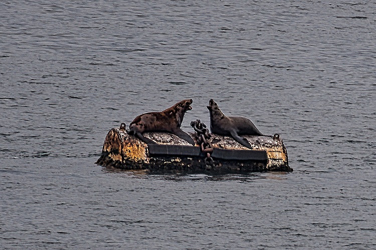 During the remaining time before our departure we took some pictures from the ship. To the aft was a view of the winding road up Mt Ballyhoo to the World War II ruins and the way we would sail away from Dutch Harbor. Looking forward was a view of Unalaska. More fun, though, was the view from our veranda, which was on the side of the ship facing the water. A ship was out there, probably some kind of work boat, with a thick cable running from its aft to a large round float. We don’t know why it was there but we do know that there were several seals and/or sea lions on it, sometimes looking relaxed and sometimes looking like they were fighting for position on the float. Whatever they were about, they were very LOUD. We heard them long before we saw them and their serenade went on for most of the afternoon. Very entertaining.