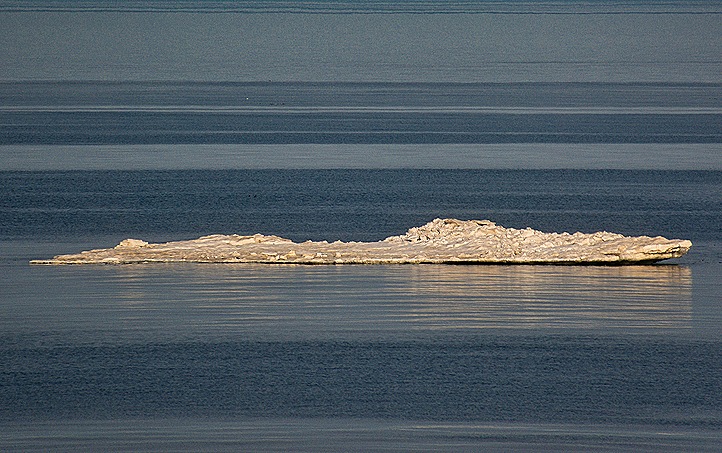 By this time we were in the Bering Strait, a body of water about 50 miles wide at its narrowest and about 300 ft deep that divides the Bering Sea from the Arctic Ocean. This is a very shallow part of the ocean and is thought to have been dry land during the height of the glacial period when ocean levels fell as a tremendous amount of water was absorbed into the world wide glaciers. Scientists today think that humans probably first spread into the Americas across this land bridge between Asia and America. The islands we will see today were once mountain peaks in this land bridge, which is sometimes called Beringia today. Like the Bering Sea, the Bering Strait is named for Vitus Bering, a native of Denmark who explored this area under the Russian flag in the 1720’s and 30’s. Here’s what the Bering Strait looked like from the aft of the ship in the morning before the crowds arrived.