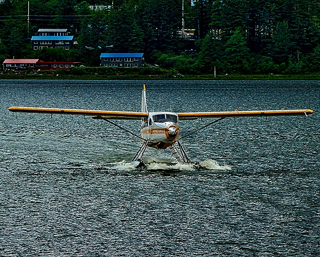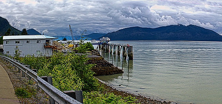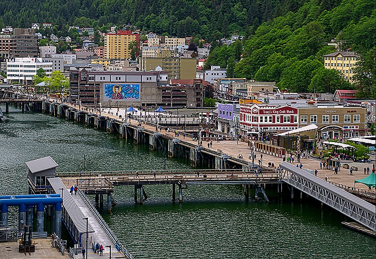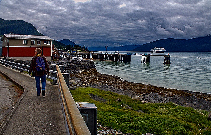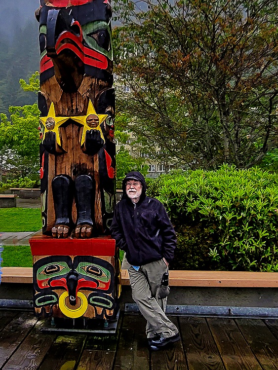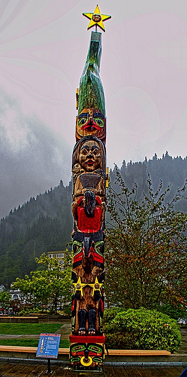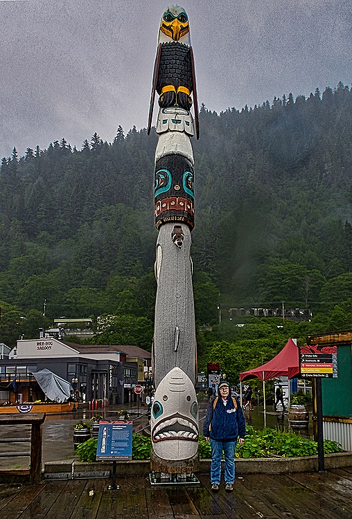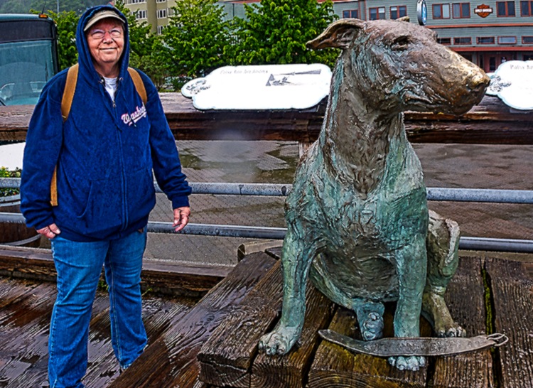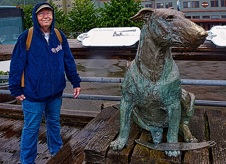 Juneau is colorfully festooned with totem poles, some of which are in this area as well. Most are of recent vintage (the last two or three decades) and carving them appears to be a thriving profession here. Most of these contain symbols representing particular clans that are indigenous to the area. One of the poles we encountered in this area is unusual in having a star on top, kind of like a Christmas tree, representing the Little Dipper, above a dog salmon, and at the bottom a raven with a box of daylight that he released to bring light to the world. Another distinctive pole had a large bald eagle at the top and a shark at the bottom. Also in the dock area was a statue of Patsy Ann, a dog who lived in Juneau from 1929 to 1942. She was deaf all her life but had an unerring ability to sense an approaching ship from half a mile away. At that time shipping schedules and communications were less exact, so often the first indication a ship was arriving was when Patsy Ann suddenly headed for the dock. And she also knew where the ship would dock; on at least one occasion she went to a different pier from where the crowd was waiting and the ship docked where she stood. This resonated with us because we had a dog named Addie who always knew when one of us was approaching even when the car was a few blocks away.