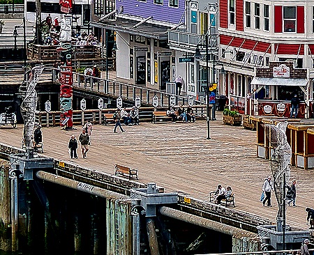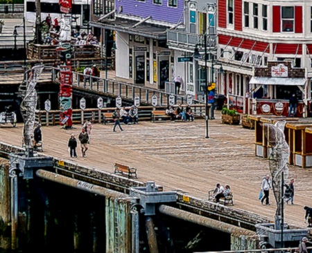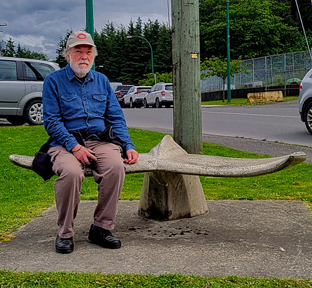 The excursion ended back at the dock but it was early yet so we decided to continue on foot. It turned out that most of the walking was uphill and there was quite a bit of construction to circumvent. Combined with our unusually large lunch, this made the going a bit challenging. But we persevered. Walking up the hill we visited the Icehouse Cooperative Gallery selling local arts and crafts. In a small park next to it was a concrete bench sculpted in the shape of a whale’s tail, one of several such benches in the waterfront area. We also walked past what looked like a weather beaten wood garage with an apparently old totem pole in front.