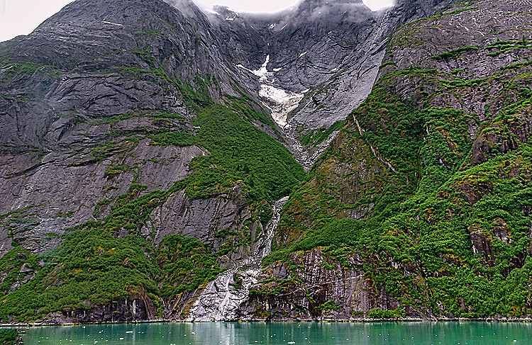 Tracy Arm and Endicott Arm are lengthy fjords branching out from Holkham Bay some 45 miles south of Juneau. Both were carved by glaciers. As we sailed up Endicott Arm we passed nice waterfalls descending from impressive mountains under a low and heavy cloud cover. But no serious ice blockage.