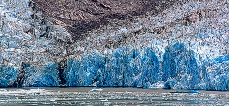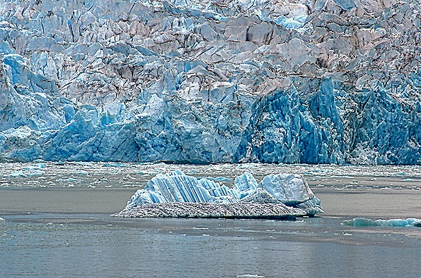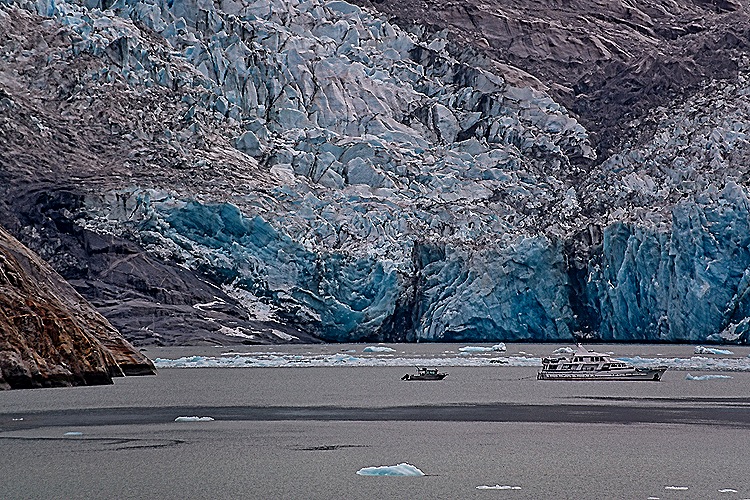 The face of Dawes Glacier is a bit more than half a mile wide and about 600 feet tall (with another 300 feet or so below water). Two glaciers join to form the tidewater terminus. It is known for active calving (it flows toward the water at about 15 feet per day) but we didn’t see any. This glacier is retreating, so at some point in the near future the two flows seen together at its face will likely separate. Harbor seals live and mate on floating ice in this area but we didn’t see them. The face of the glacier is a nice blue color.