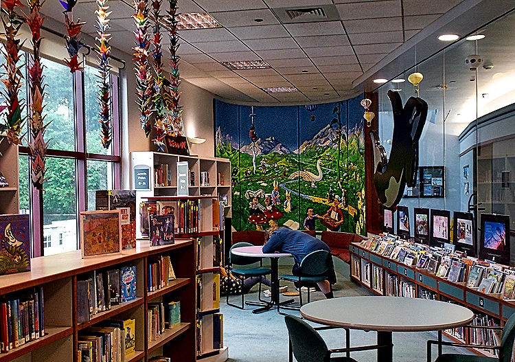 We visited the Juneau Public Library, housed in an upper floor of a modern building that seems mostly filled by a parking garage. The last time we were here, in 2017, it was closed but this time we went inside. It had some nice artwork, pictured below over the check out desk and in the children’s room, and a wire relief of two birds (raven and eagle perhaps?) above a restroom on one side of the building outside. One large window had a panoramic view of another part of the dock area, with Mt Juneau covered in spooky clouds.