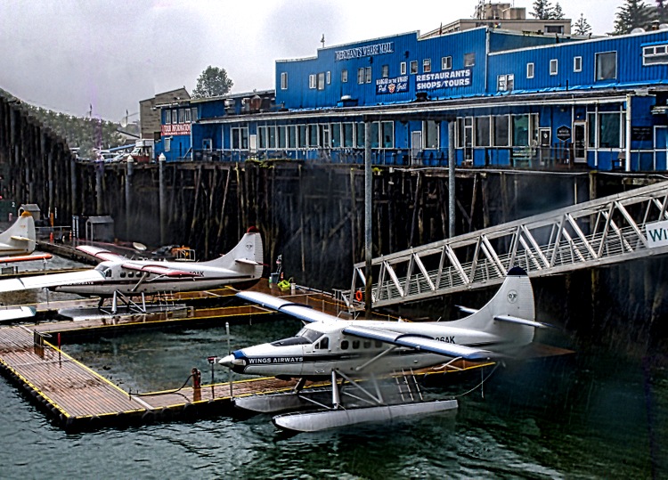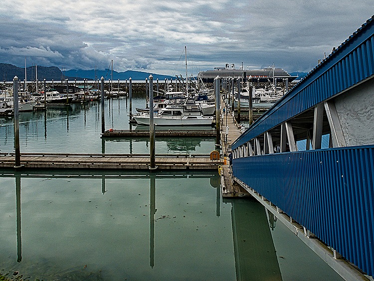 Today was our wedding anniversary and the ship was in port late so we went out to dinner. We ate at a restaurant on the dock within easy walking distance of the ship called The Hangar On The Wharf. More than 25 years old, this is Juneau’s only waterfront restaurant. More of a pub than a fancy restaurant (purportedly offering more than 100 varieties of beer), we found the food here to be really excellent. In particular, we shared a bowl of the best chowder we had ever had (made with halibut, not clams) and one bowl was enough for two meals. We also shared a huge slice of delicious Grasshopper Pie; when it came we were very glad we decided to share one slice. This is called The Hangar because in the 1930’s this was the location of a hangar for sea planes, which still land and park in the water outside the building. The restaurant is located inside the blue mall building in the picture below.