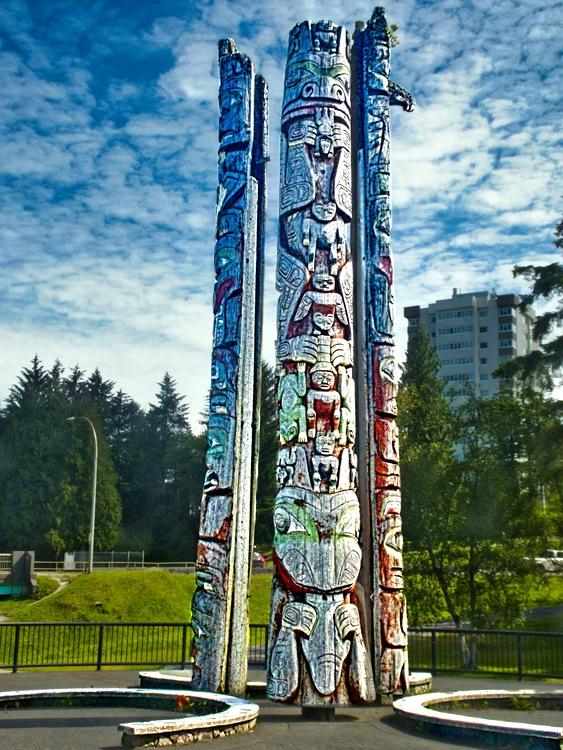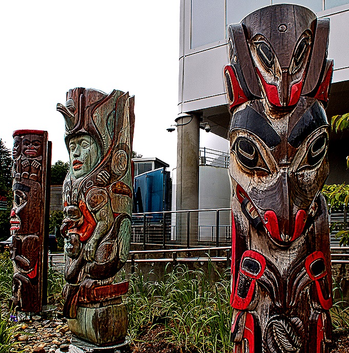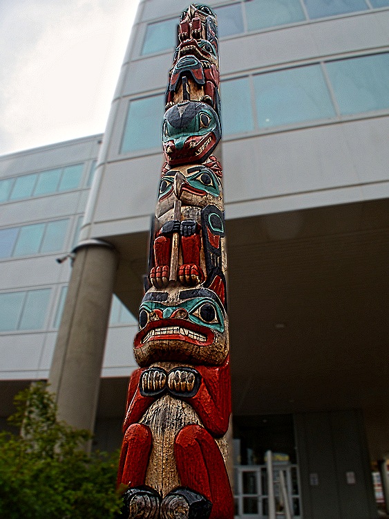 A raised plaza outside the museum had a number of sculptures on display and yet another totem pole on the edge facing the street. The pole was topped by what looked like back to back men in top hats and had a salmon at the bottom. This was a 360 degree totem pole, with carvings facing in all directions. Across the street, beyond this totem, was the Institute’s headquarters building, very distinctive with floor to roof glass and wooden panels with red reliefs on them. The main thing we saw inside was a carved and painted wall of what we think was a native style building. We were out of time to explore this building further, but near the entrance was a fabulous gift store selling mainly very impressive indigenous art.