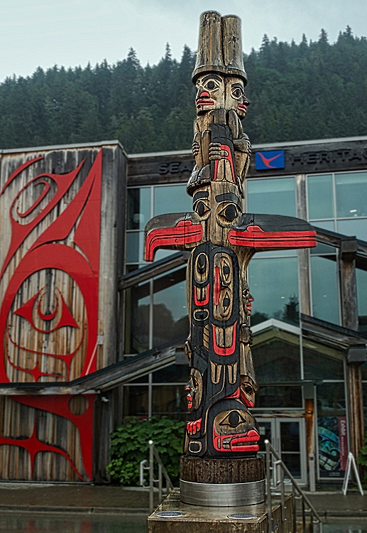 Sealaska Heritage Institute is an organization dedicated primarily to education and promotion of the culture of the Tlingit, Haida and Tsimshian cultures of Southeast Alaska whose ancestors have lived here for more than 10,000 years. We visited its central facility in Juneau, including a museum displaying native art inside and outside, and its administrative headquarters across the street.