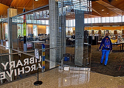 If you have read this blog before you know that we seek out libraries in the places we visit. But today was a bonus visit because we were able to visit two libraries. The public library was discussed above, but after leaving Sealaska we walked on to find the Alaska State Library. Opened in 2016, this library is on the second floor of a building that also houses the archives and a museum. Known locally as SLAM (State Library And Museum), it is an open and modern feeling facility with many displays of historic documents and pictures. Behind the front desk is a long set of beautiful stained glass panels with a wilderness theme.