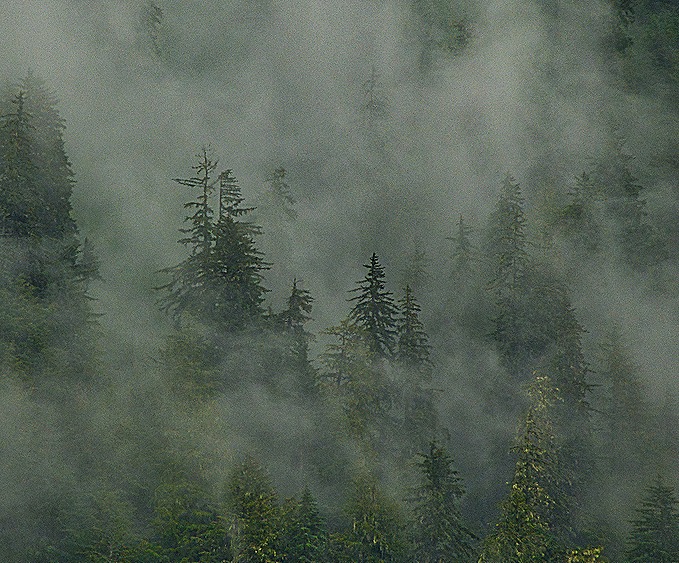 We walked back to the ship, past yet another totem pole and a view of the trees on the mountain slope wrapped in a swirl of cloud and fog.