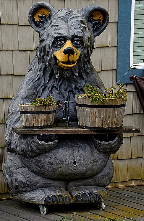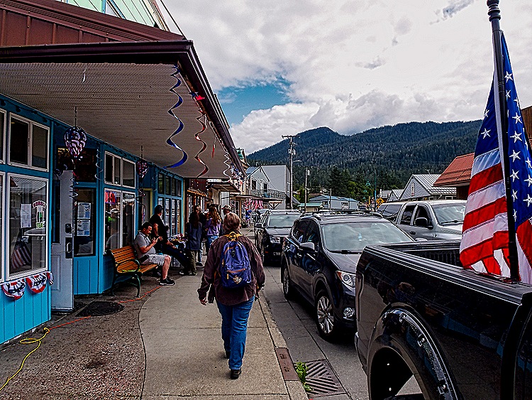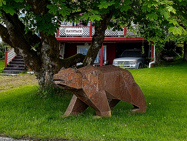 It was a long walk, more than a mile, into town. Just outside the port we saw what appeared to be some kind of fish traps piled high, presumably waiting to be used. We also passed several houses decorated for Fourth of July, a bear sculpture in someone’s front yard, an old car and a lot of flowers. This is a small and remote American town with a population just over 2,000 and that is what it looked like, especially today when it was decked out for a patriotic holiday.