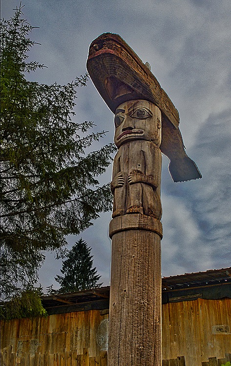 As we approached the museum we passed a set of three totem poles in a row, then a taller one around the corner of the building (which had an eagle on top and a bear on the bottom.