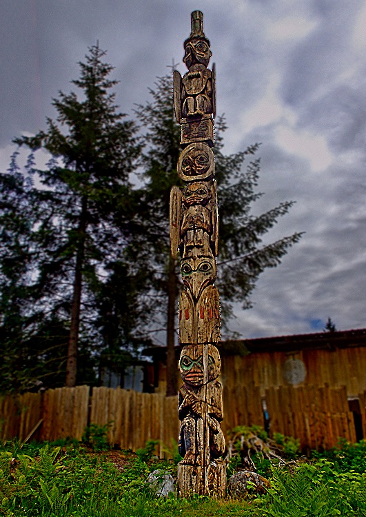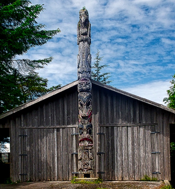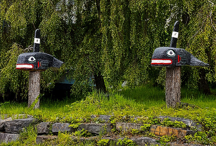 Our first stop was at the Kwinitsa Station Railway Museum. Built in 1911, this was one of many identical stations built along the Grand Trunk Pacific Railway (which was taken over by the government in 1919). This is one of only four still in existence and it now houses a railway museum (we saw it only from the bus window). It was moved about 40 miles from Kwinitsa to Prince Rupert in the 1980’s on a barge. Nearby is an interesting sculpture of a whale with a calf.