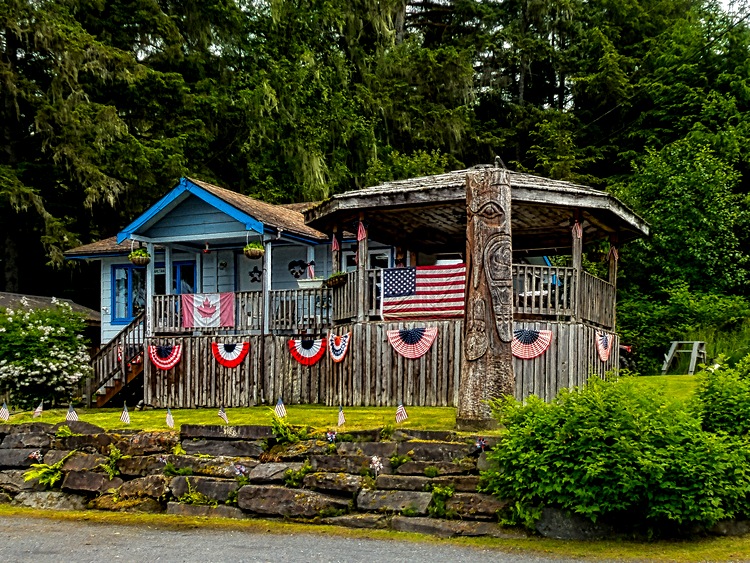 We walked up the main street in downtown Wrangell, stopping in a few stores on the way. Few really old buildings remain because a large fire in the 1950’s destroyed much of the town. Then we headed back to the tender dock, passing on the way an interesting house fixed up for Fourth of July, but with a Canadian flag tucked into the display.