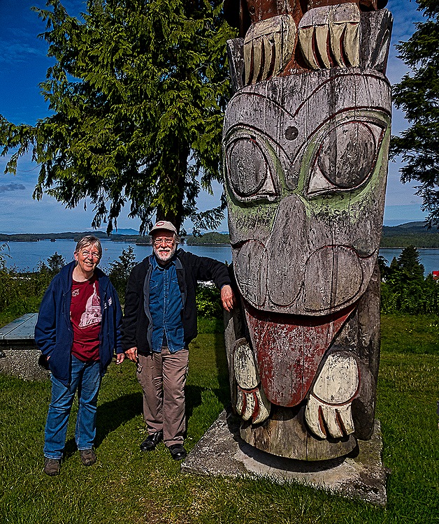 You can see in the first picture at the top that the city rises fairly steeply from the waterfront onto a hill. We drove up there and through Roosevelt Park, an area named for President Franklin Roosevelt because of all the aid the Americans provided here during World War II, when Prince Rupert was an important transportation hub for the defense of Alaska. The park was on the edge of a hill overlooking Prince Rupert. Its centerpiece was a totem pole that we understand is a replica of one that came from an old Haida village called Yan on Queen Charlotte Islands. It is called the Grizzly Bear Pole. It is quite tall . . . we were not as tall at the bottom figure’s eyes. A large sculpture in this park was called “The Survival of the Fittest.”