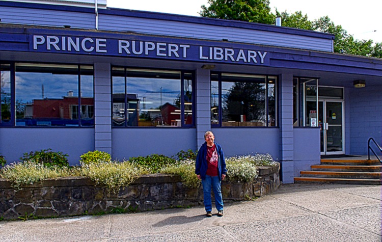 It was several blocks from here to the library. The Prince Rupert Library was founded in 1913 in a small wooden building heated by a wood stove. It moved several times but was destroyed by fire in 1968. The present library building opened in 1971. It is a nice roomy library with many displays including quilts showing local scenes and the skull of an orca calf that died near here in 2018. There was also a salmon nursery (an aquarium with many baby salmons) that was a school project and a Pride Month display (quite appropriate for the “City of Rainbows”).