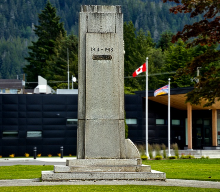 The Prince Rupert courthouse, built in 1922, is a red brick neo-classical building with four tall decorative pillars in front. Not too far away is the Cenotaph, a war memorial. It was put up in 1929 to memorialize those who died in World War I and after World War II a dark plaque was added with the dates of that war. This picture is of the back, as seen from the courthouse, but on the front is a relief of a sword and a wreath. We have seen similar cenotaphs in other countries in the British Commonwealth, such as Australia and New Zealand.