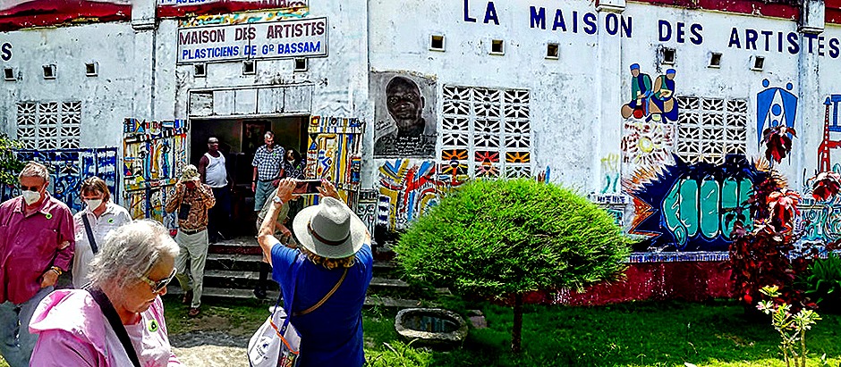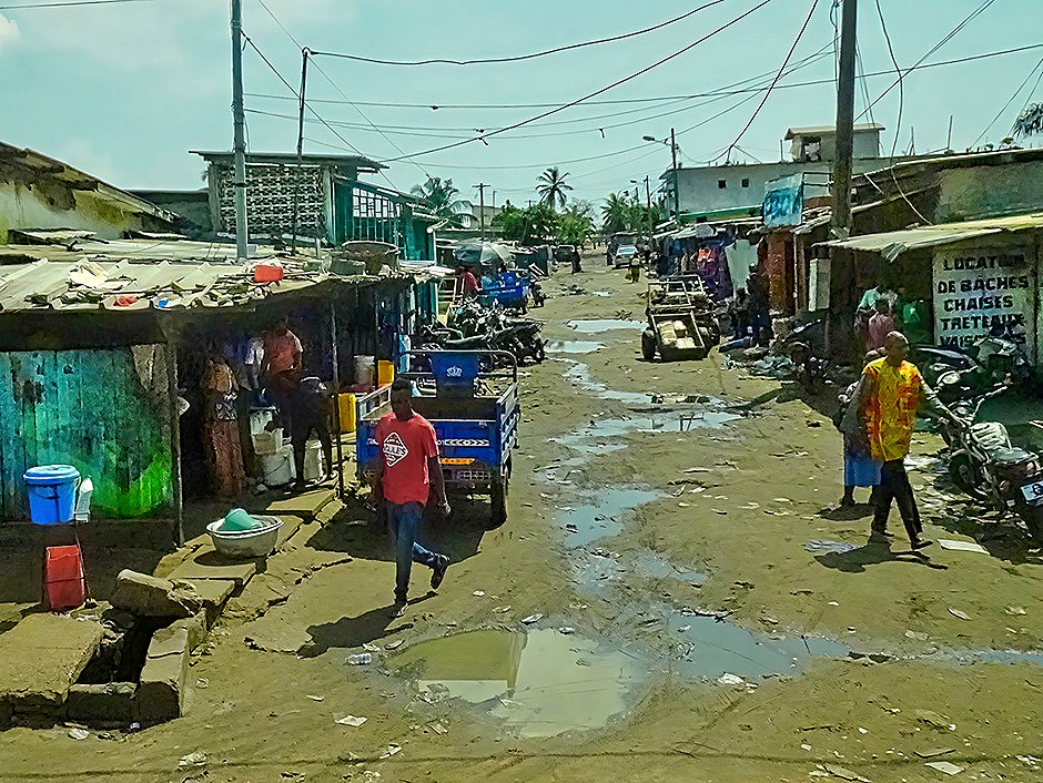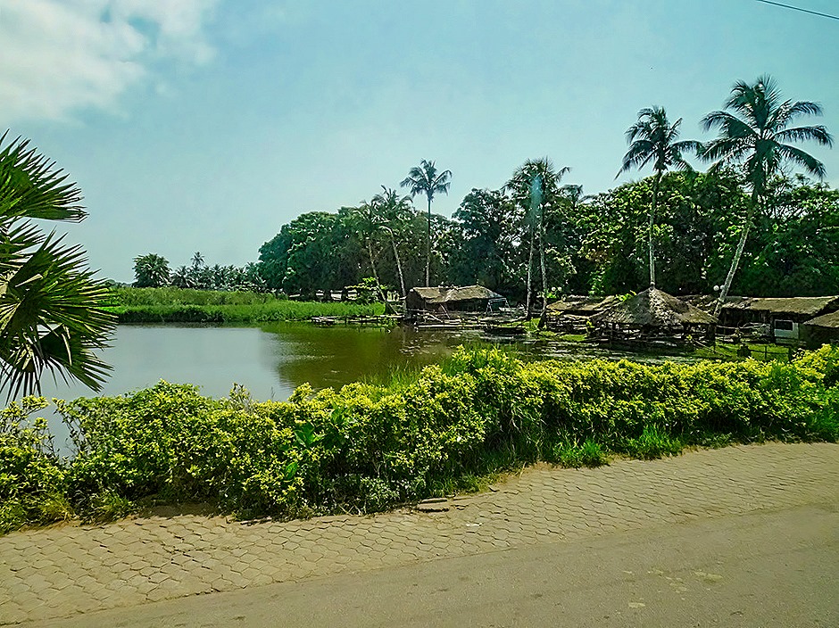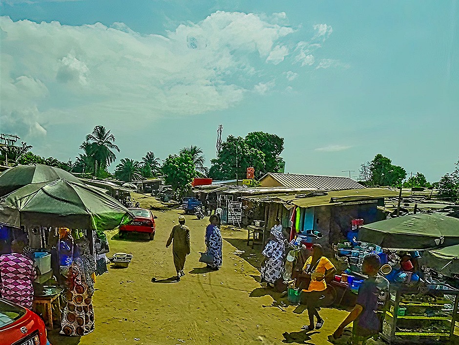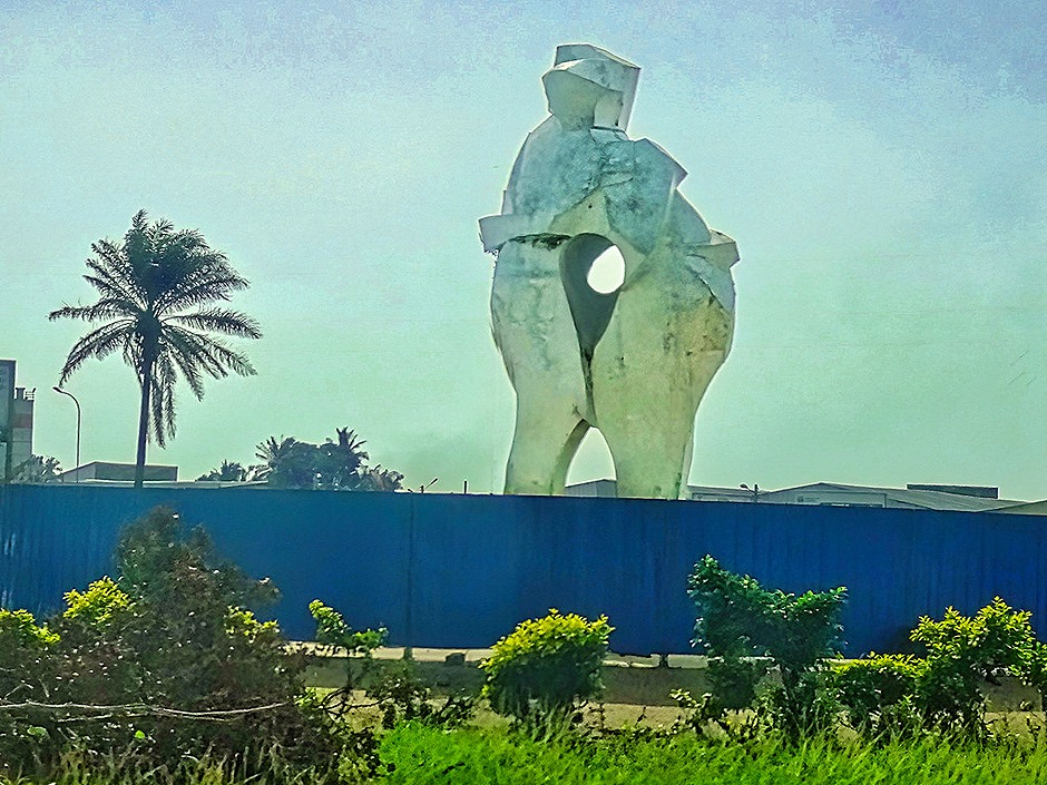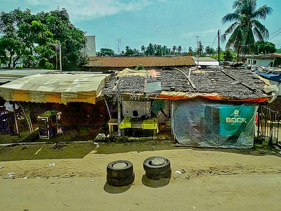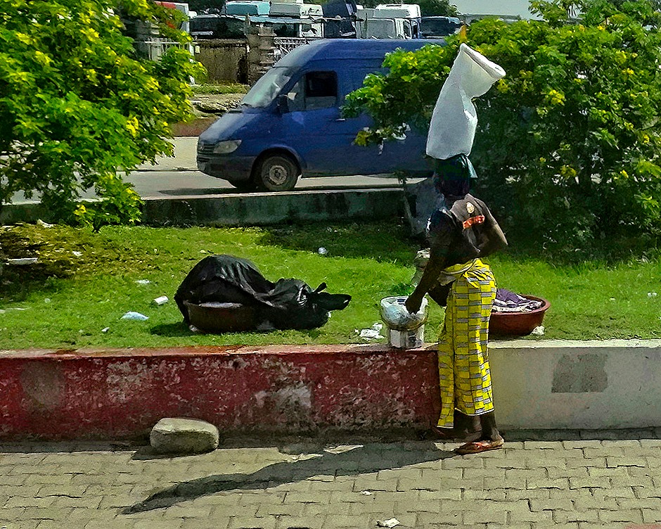 We set out in the morning in two buses for the fairly lengthy drive to Grand Bassam. We had seen quite a bit of poverty the day before in Ghana but it seemed to be much worse here. We passed mile after mile of one story wooden structures looking like they might fall down in a strong wind. There was a lot of trash and rocks strewn around the ground in many areas. But many of the people were busy and dressed in very colorful clothing which kept the area from being quite as sad looking as it otherwise might have been. We passed the Akwaba monument, a large white modern sculpture of two people hugging that was erected in 1989. Akwaba means “welcome” in several of the indigenous languages and this is a monument to hospitality situated near the airport. Many women were carrying loads on their heads. These are street photos taken from a moving bus, so not as high in quality as one hopes. It should also be remembered that this is only a small part of the area, where our bus happened to be driving, so other parts of Ivory Coast may be quite different.
