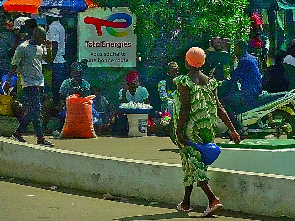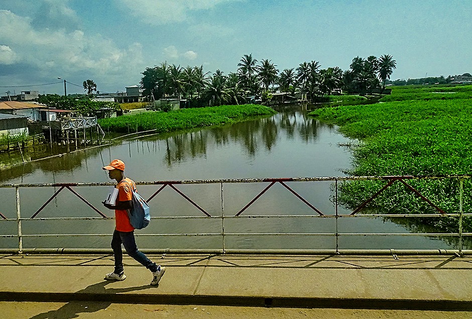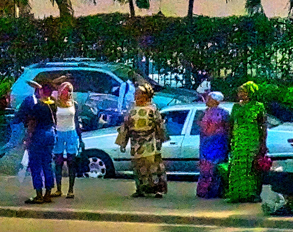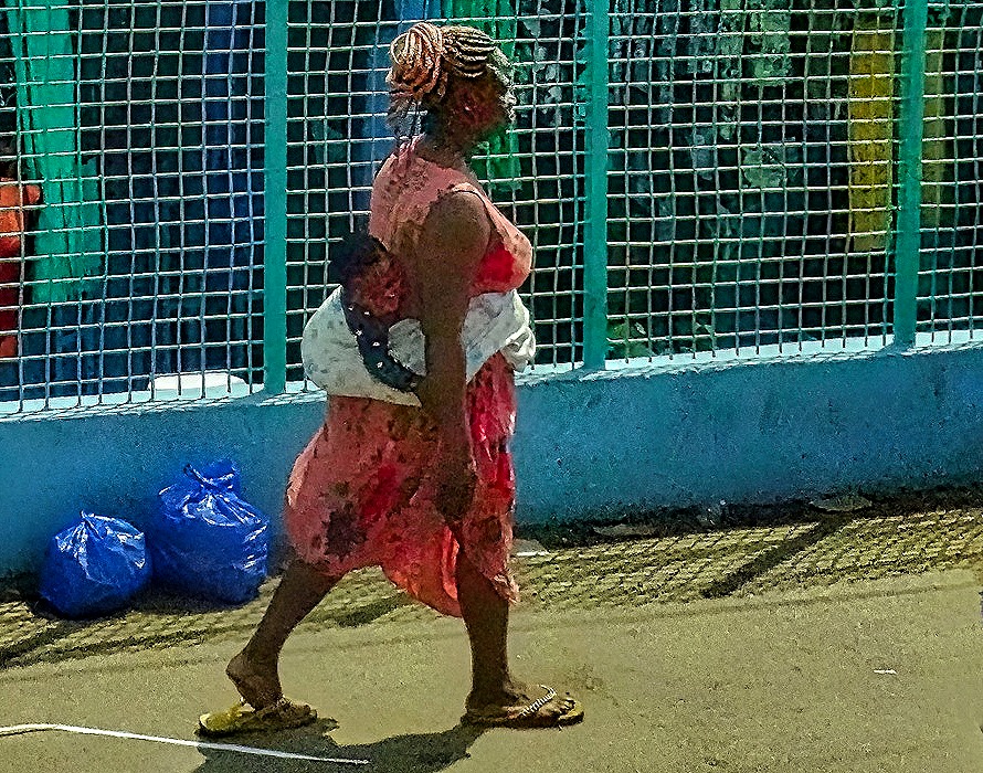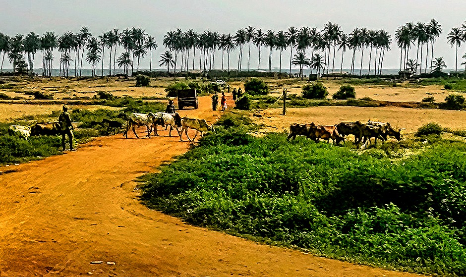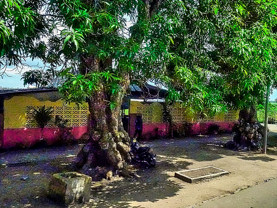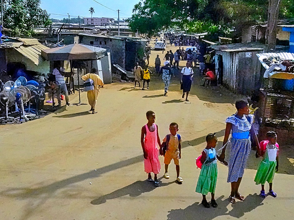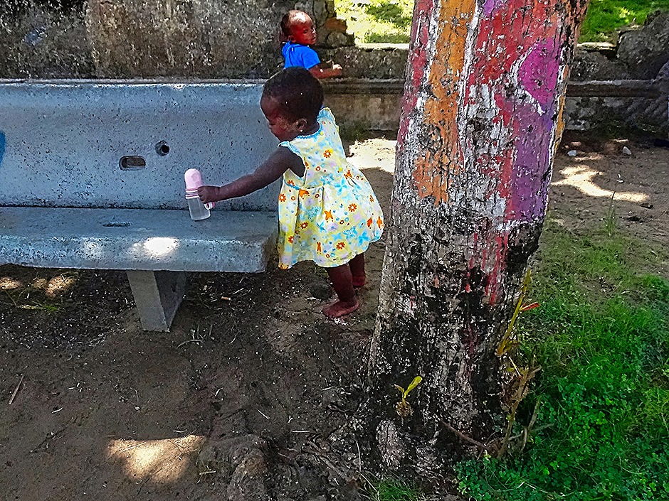 We set out in the morning in two buses for the fairly lengthy drive to Grand Bassam. We had seen quite a bit of poverty the day before in Ghana but it seemed to be much worse here. We passed mile after mile of one story wooden structures looking like they might fall down in a strong wind. There was a lot of trash and rocks strewn around the ground in many areas. But many of the people were busy and dressed in very colorful clothing which kept the area from being quite as sad looking as it otherwise might have been. We passed the Akwaba monument, a large white modern sculpture of two people hugging that was erected in 1989. Akwaba means “welcome” in several of the indigenous languages and this is a monument to hospitality situated near the airport. Many women were carrying loads on their heads. These are street photos taken from a moving bus, so not as high in quality as one hopes. It should also be remembered that this is only a small part of the area, where our bus happened to be driving, so other parts of Ivory Coast may be quite different.