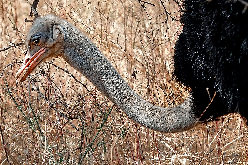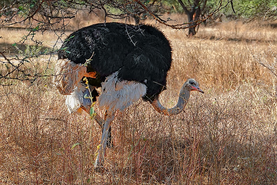 Speaking of birds, we saw two ostriches, both males (black and white feathers). Ostriches are the biggest birds on Earth and the fastest two legged runners, peaking at about 40 miles per hour. Each of the ones we saw was by itself. With their large bodies and tiny heads they looked like something out of the movie Yellow Submarine.