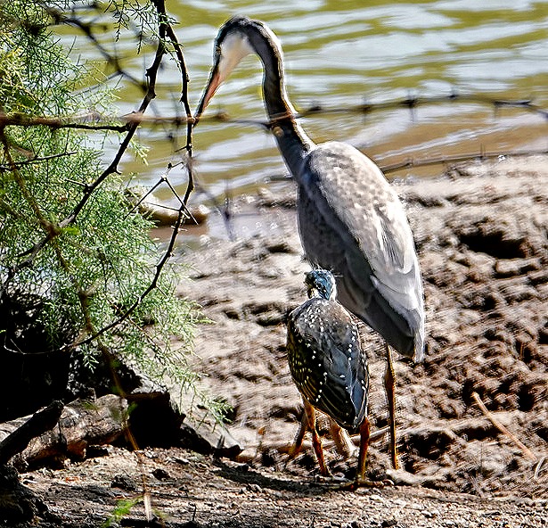 We stopped near a lake where some birds were standing on the shore. We don’t have identifications but the tall one may be a heron.