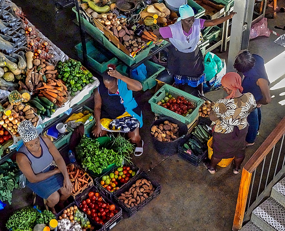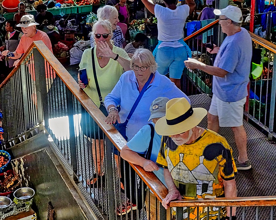 We returned to the bus at the appointed time and had to wait . . . and wait, because there are often some people who think they are entitled to take as long as they want, here to eat and shop, before joining the others at the bus. Then as we finally left the reserve one of the passengers asked the guide if he could have something to drink. They didn’t have anything (some people bring their own water if this is important to them) so the whole bus full of people pulled over at what looked like a sort of drug store and we all waited while he went inside and bought some soda. We were irritated because the last time we were here there was a great impromptu market spread out on the dock and since we had missed shopping (and everything else) in Cape Town we were hoping to do some here. But as we got back into town, already much later than advertised, the guide announced we were going to stop at a large local market at the request of a couple of passengers who wanted to shop there. This was met by a loud chorus of “No, take us to the dock” from most of the other passengers but that made no difference. The bus pulled into an alley through traffic and the guide and about three people got off the bus and went into the market while the other 40 or so people just sat on the warm bus waiting for them. After about 25 minutes (I think) they finally returned, having purchased . . . nothing.