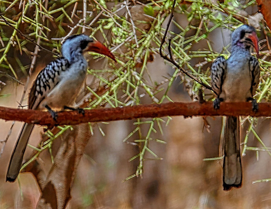 A couple of showy types of bird were around too. We saw two Western Red-Billed Hornbills sitting on a branch. Elsewhere on the ground we saw what is probably a Long-tailed Glossy Starling. It’s back was a shiny metallic looking blue-green and it had round yellow eyes that looked a little freaky. A startling starling!