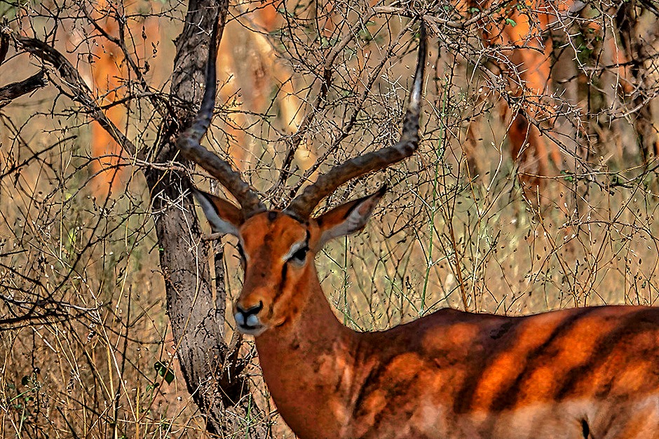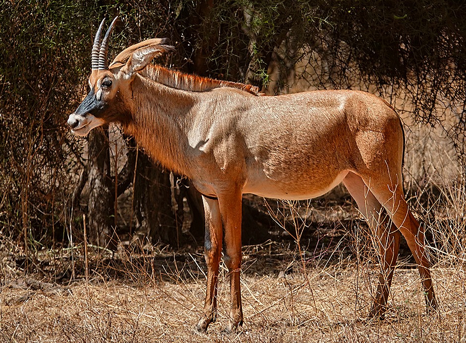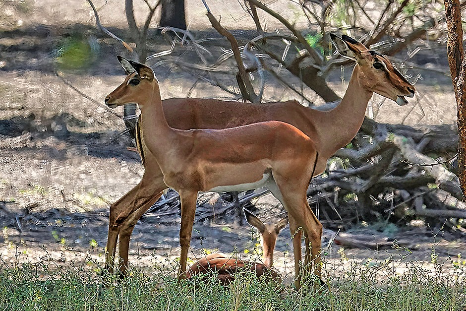 We saw several kinds of antelope. The Roan Antelope is striking for its black and white face and curved horns, resembling an Oryx with shorter horns. The Eland has straight horns and a clear beige face. We saw a group of them in some woods. Impalas were also there. We had seen them in herds during our 2018 South Africa safari, but here it looked like just a family group. In South Africa they provide food for the big cats and other predators, but there was none of that here.